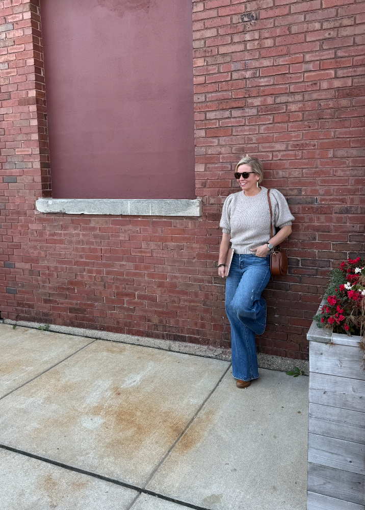 Timeless oatmeal sweater with puff sleeves-effortless styles that transitions from day to night. Size small shown.