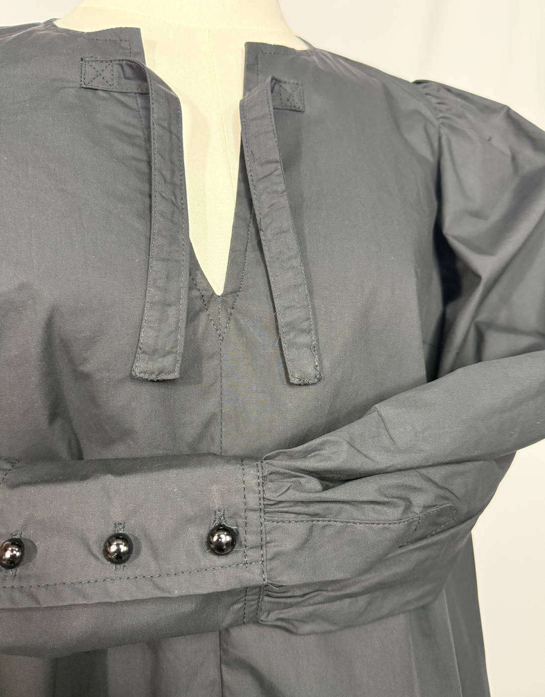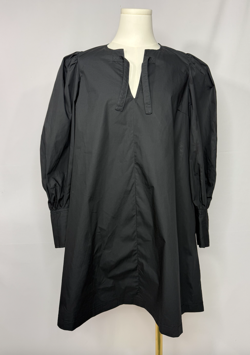 A modern take on timeless style — this black poplin dress features puffed shoulders, a split neckline, and polished button-cuff details. Effortlessly chic from day to night. The subtle A-line shape offers movement and comfort. Pair with your favorite ballet flats or tights and boots. Size small shown in photos.